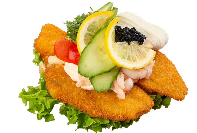 Stjerneskud med kogte og stegte fiskefileter, rejer, asparges, stenbidderrogn og diverse pynt.
