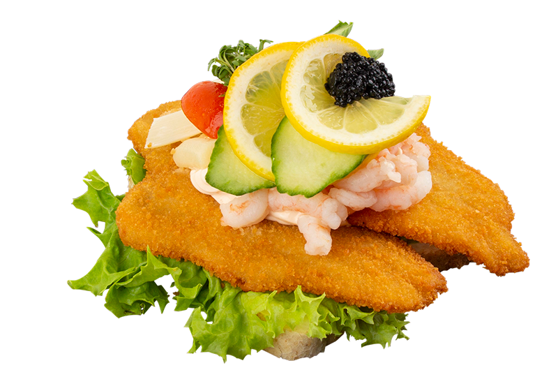 Stjernekaster med 2 stk. fiskefileter, rejer, asparges, stenbidderrogn og diverse pynt.